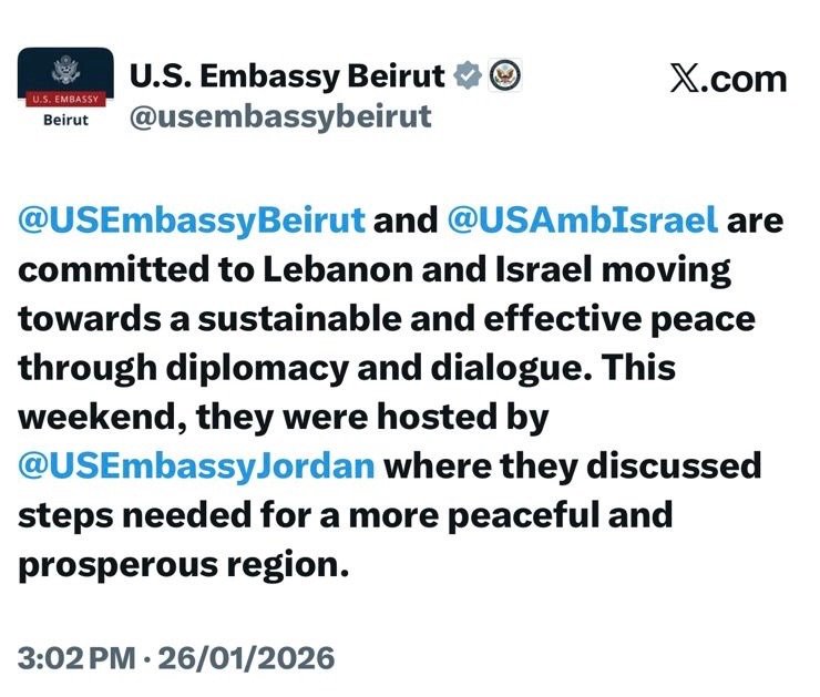 قالت السفارتان الاميركية في بيروت وتل ابيب انهما تلتزمان بدعم انتقال لبنان وإسرائيل نحو سلام مستدام وفعّال من خلال الدبلوماسية والحوار. وفي نهاية هذا الأسبوع، استضافتهما السفارة الأميركية في الأردن، حيث ناقشوا الخطوات اللازمة لتحقيق منطقة أكثر سلامًا وازدهارًا.